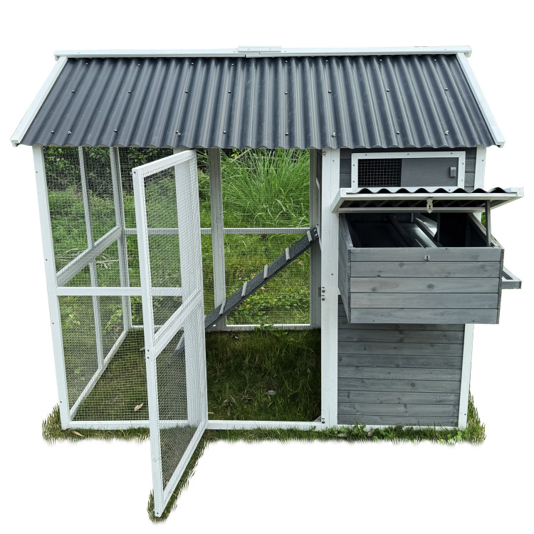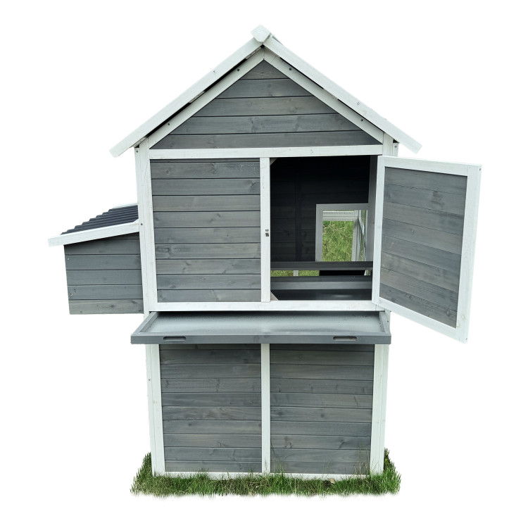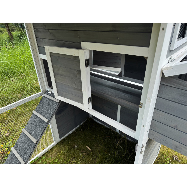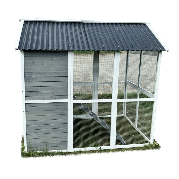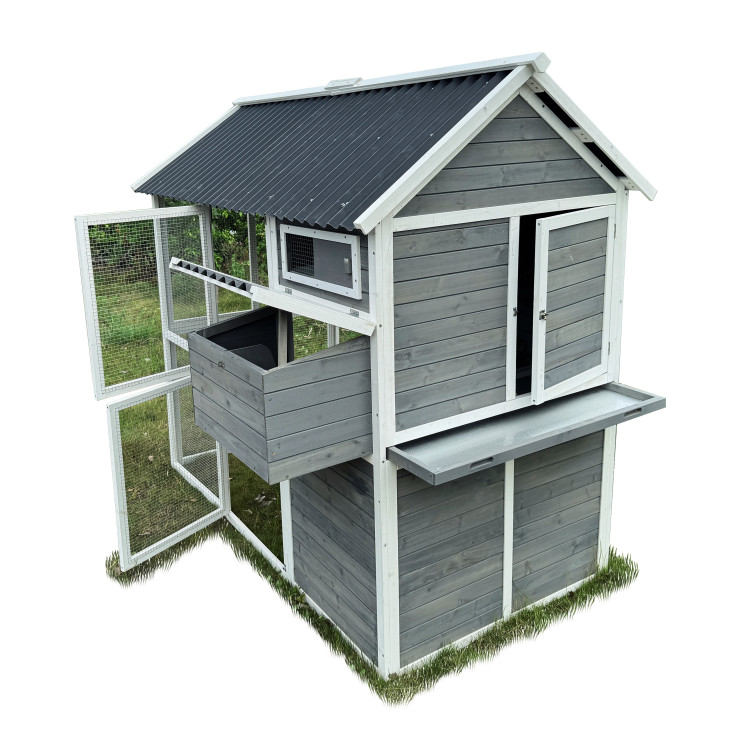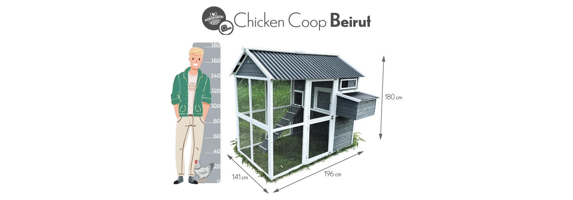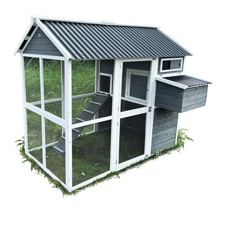 Kurník Bejrút je prostorný a elegantní přístřešek pro vaše slepice, spojuje kvalitu, bezpečí a styl. S rozměry 196 × 141 × 180 cm poskytuje domov až pro 6 slepic. Stěny kurníku jsou z masivního dřeva v kombinaci šedé a bílé barvy, materiál střechy je vlnitý plast, který zcela bezpečně chrání před deštěm, sněhem i horkým sluncem. Součástí je také velký oplocený výběh z pozinkovaného pletiva, kde mají slepice dostatek prostoru k pohybu na čerstvém vzduchu a trávě.Uvnitř kurníku se nachází hřad pro noční odpočinek, rampa spojující obytnou část s výběhem a boční snáškové hnízdo s výklopnou střechou pro snadný sběr vajíček. Snadnou údržbu zajišťuje výsuvný trusník (výsuvná podlaha). Zdraví vašich slepiček prospěje ventilační okénko s pletivem, které zajišťuje přístup čerstvého vzduchu, který je pro správné životní podmínky zcela nezbytný. Přístup dovnitř kurníku je snadný díky velkým dvířkům na přední i zadní straně a bočním dveřím do výběhu.