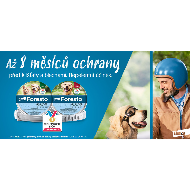 Antiparazitní obojek Foresto je určen pro psy nad 8 kg a poskytuje dlouhodobou ochranu proti blechám a klíšťatům až po dobu 8 měsíců. Díky moderní technologii se účinné látky postupně uvolňují z povrchu obojku a rovnoměrně se rozšiřují po kůži a srsti psa.