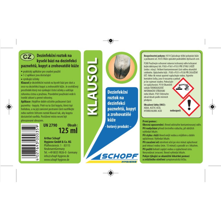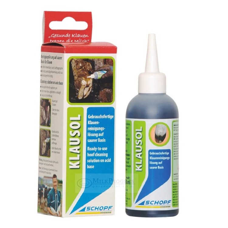 Klausol je hotový dezinfekční roztok na kyselé bázi pro hovězí dobytek a ovce na dezinfekci paznehtů, kopyt a zrohovatělé kůže. Spolehlivě spálí nekrotické tkanivo, účinně zlikviduje hnilobu paznehtů u skotu, ovcí a hnilobu kopyt u koní. Jednoduchá a rychlá aplikace při akutních potížích.