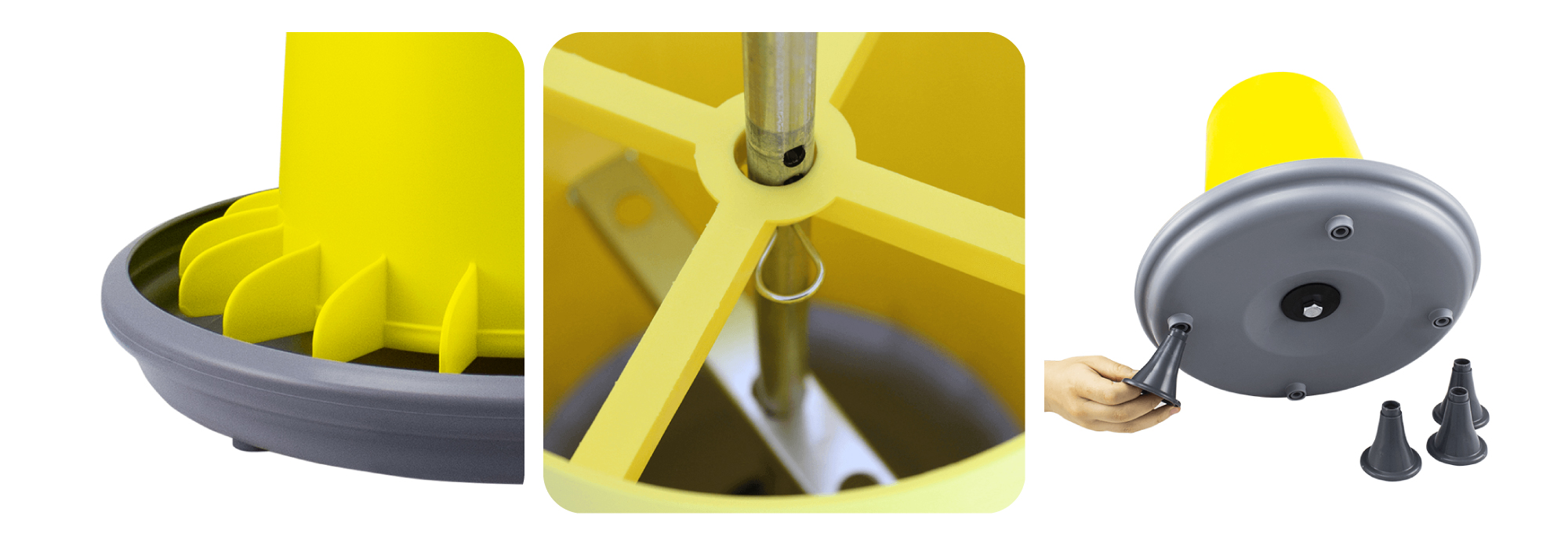 - Nastavitelná výška krmiva v misce: Krmítko je vybaveno kovovou nosnou tyčí se třemi polohami nastavení. Pomocí závlačky si jednoduše zvolíte, kolik krmiva bude v misce – podle typu krmiva i chuti drůbeže.