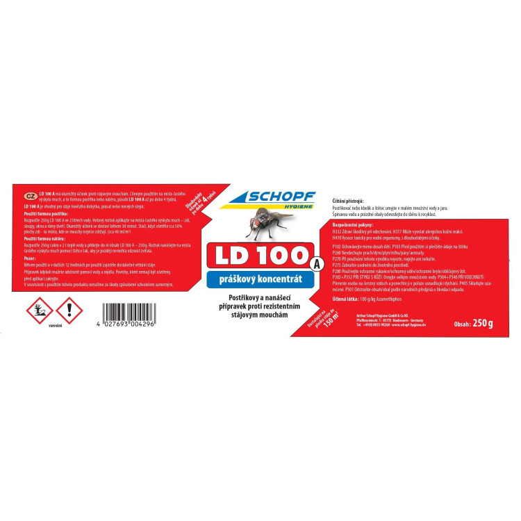 Práškový koncentrát SCHOPF LD 100 A je účinný přípravek pro hubení stájových much ve stájích, drůbežárnách i hospodářských objektech. Nabízí téměř okamžitý účinek a dlouhodobou ochranu až na několik týdnů.