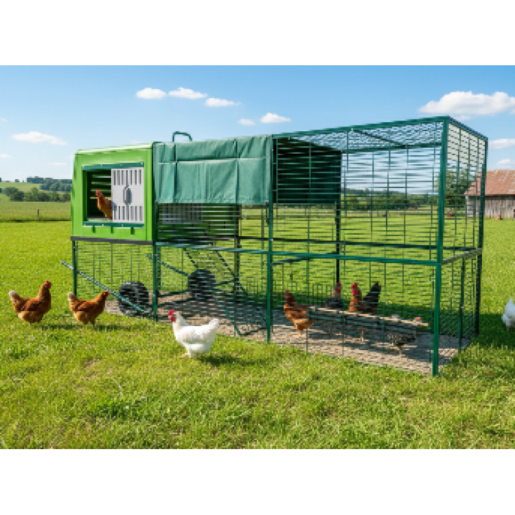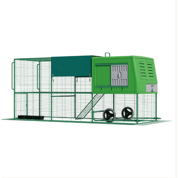 Díky integrovaným kolečkům lze kurník relativně snadno přemístit na jiné místo zahrady. Přesun na čerstvou trávu podporuje přirozené chování slepic a pomáhá rovnoměrně zatěžovat pozemek.