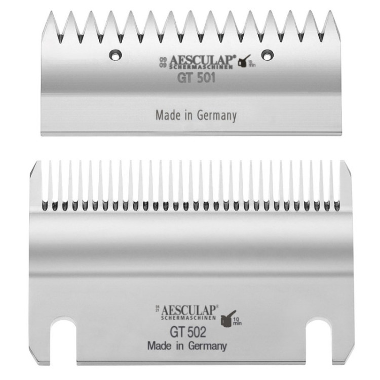 Sada stříhací nožu Aesculap se skládá z horního nože GT 501 (15 zubů) a spodního nože GT 502 (31 zubů), které jsou navrženy pro strojky Aesculap Econom CL a Econom II, známé svou spolehlivostí a výkonem. Přesné CNC obrábění zaručuje konstantní kvalitu a ideální tvrdost materiálu, což znamená rovnoměrný střih bez tahání a vynechaných míst. Nože jsou vyrobeny v Německu, takže se můžete spolehnout na špičkové zpracování a dlouhodobou funkčnost i v tvrdých podmínkách na farmě.