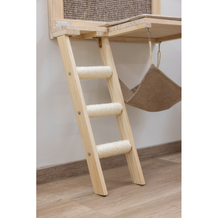 Elegantní, praktické a víceúčelové odpočívadlo pro kočky na stěnu obsahuje odpočívací plochu s polštářem, škrabadlo ze sisalu a závěsnou houpací síť. Kočičí škrabadlo je vyrobeno z robustního dřeva, sisalu a polyesteru a zaručuje tak odolnost a stabilitu. Integrované škrabadlo ze sisalu pomáhá udržet drápky zdravé a zároveň ušetří nábytek od škrábancu. Kolem schudků je omotán sisal pro pohodlný a bezpečný přístup na pozorovatelnu.