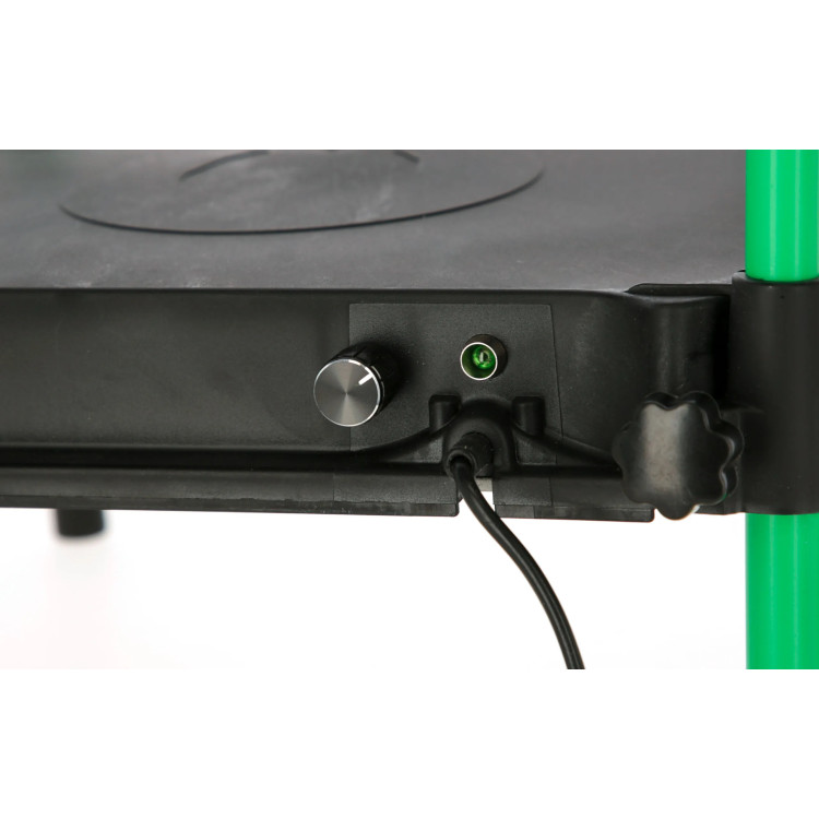 Otočný knoflík pro rychlé doladění teploty, nohy s možností nastavení výšky pro přizpůsobení vzdálenosti od kuřat a rovnoměrné rozložení tepla.